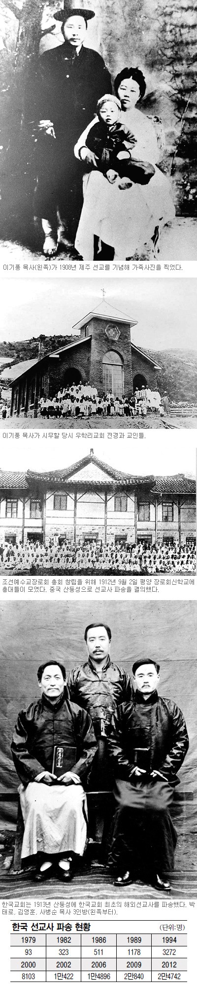 ◇초기 한국교회의 선교사 파송=한국교회 역시 이러한 흐름 속에 있었다. 1885년 한국 땅을 밟은 언더우드와 아펜젤러 선교사는 학생자원운동의 열매였다. 1903년 원산대부흥과 1907년 평양대부흥은 해외 선교를 앞당겼다. 1907년 장로교 최초로 목사 안수를 받은 7인 중 한 명인 이기풍 목사는 이듬해 복음의 불모지 제주에서 선교를 시작했다.