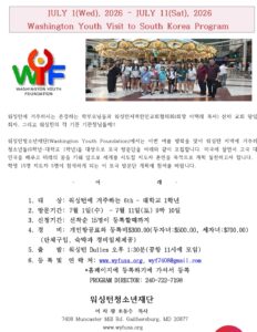 워싱턴청소년재단(Washington Youth Foundation)에서는 이번 여름 방학을 맞아 워싱턴 지역에 거주하는 청소년들(6학년-대학교 1학년)을 대상으로 대한민국 방문단을 아래와 같이 모집합니다. 세계 속에서 빛나는 대한민국을 배우고, 미래의 꿈을 키워 앞으로 세계를 지도할 지도자 훈련을 목적으로 계획 실천하고자 합니다.